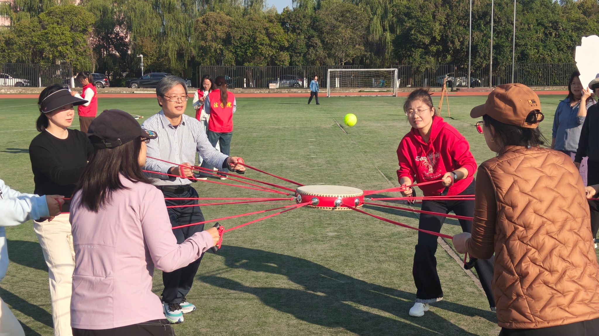 团体赛中,老师们充分热身,为集体荣誉而战。“同心鼓击球”项目中,大家默契配合拉动绳索,让皮球在鼓面持续弹跳;“急速三子棋”赛场,大家接力运棋、巧妙布局,争夺连线胜利;“套大鹅”项目中,每支队伍提前明确分工,彩色套圈在空中划出弧线,呐喊声此起彼伏;“背对背夹球跑”中,老师们发挥奇思妙想,有循规蹈矩的挟持式运球跑,也有凭借“超人”力量的连人带球跑;“赶鸡入笼”项目中,4名队员接力参赛,首棒队员率先出发,轻轻挥动扇子,借助风力引导“鸡”向鸡笼方向移动,碰到犟种鸡时,参赛队员果断采用精准打“鸡”的非常手段予以制裁,观众席不时传来阵阵哄笑。