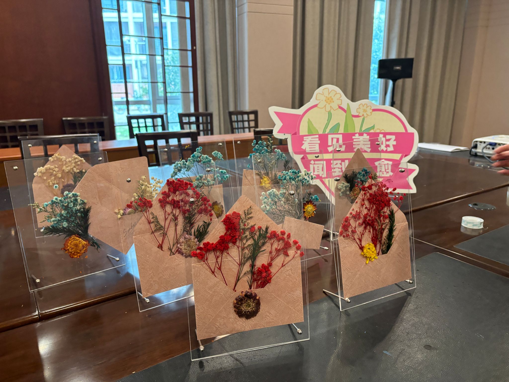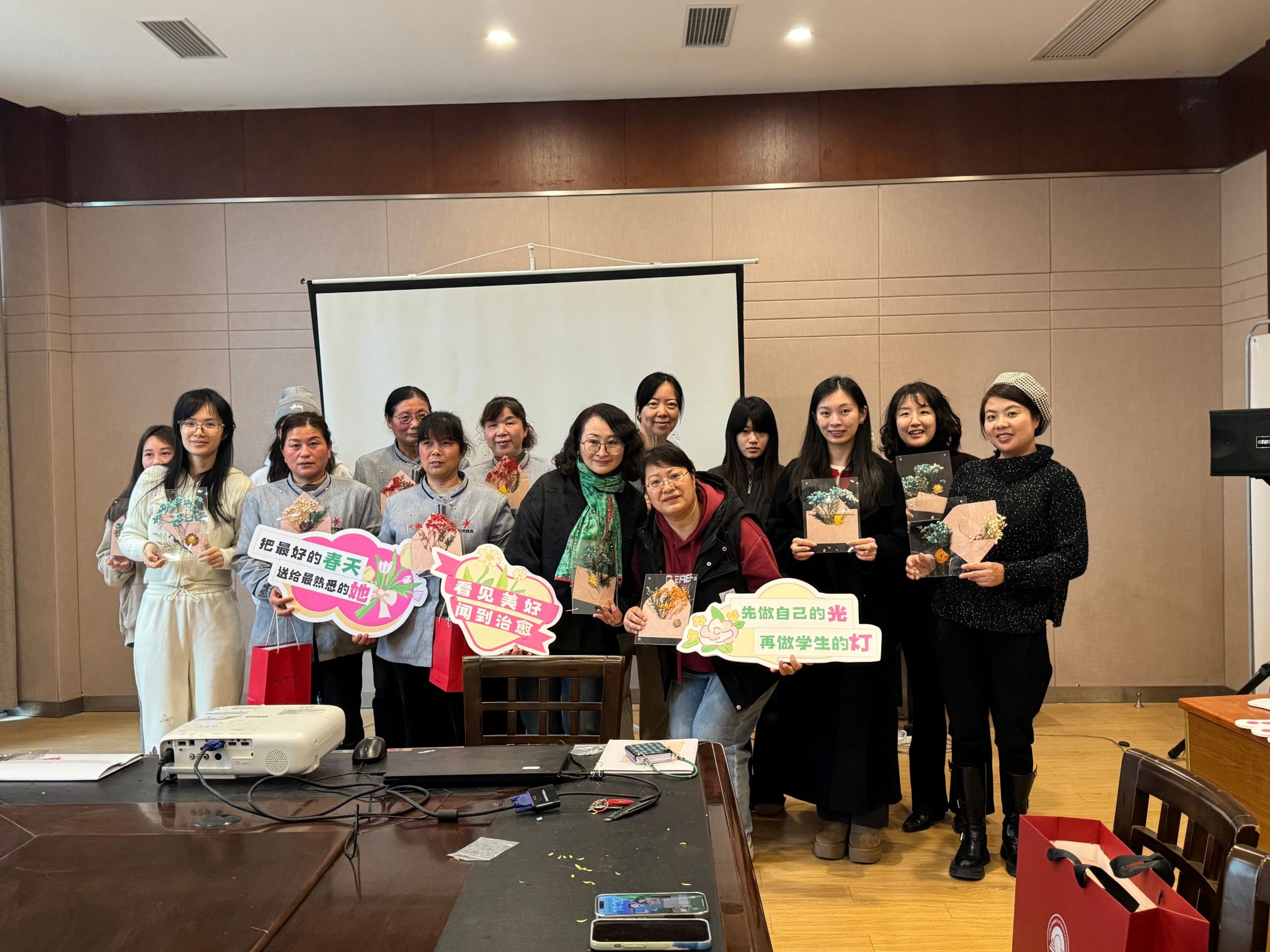 拾花酿春,定格美好。在“春日来信”压花创作过程中,师生们以干花为笔、纸张为媒,将春日的绚烂定格于方寸之间,借由一朵朵压花向生命中重要的女性表达情意。本次活动特别邀请了校园保洁阿姨代表到场,与师生共赴这场艺术之约。创作结束后,学生们不仅将作品献给身边的女教师,更带着满载心意的压花画走进食堂、宿管站,送到一线工作人员手中。 这些承载着敬意的花艺作品,成为了连接学生与校园守护者的情感纽带,让平凡岗位上的“她力量”被看见、被尊重。